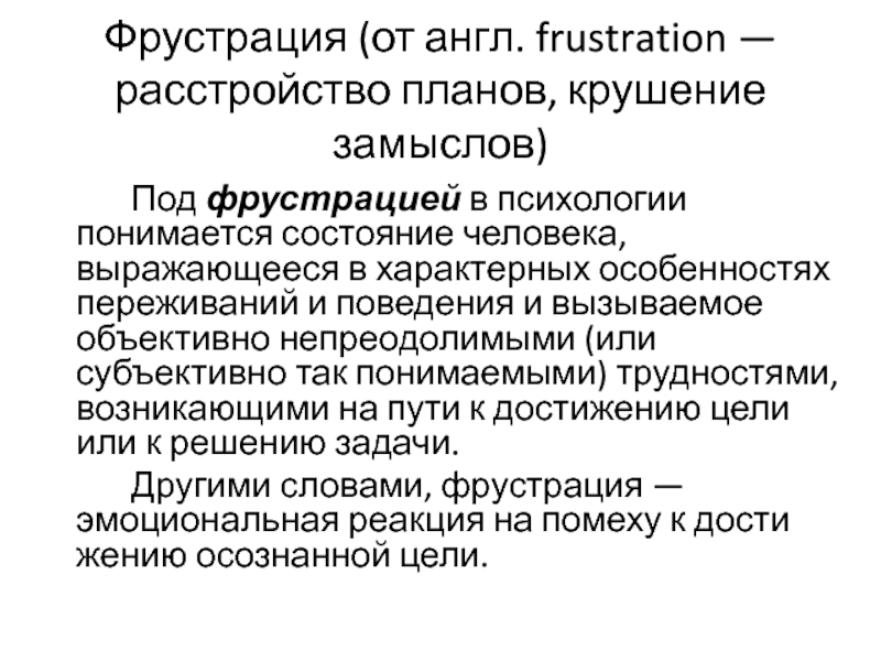 Другими словами, фрустрация — эмоциональная реакция на помеху к достижению осознанной цели.