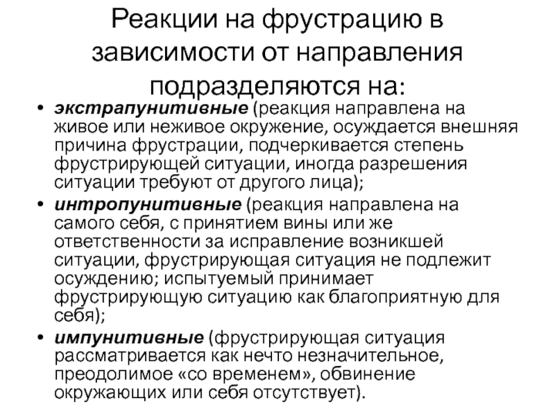 Слайд 15Реакции на фрустрацию в зависимости от направления подразделяются на: