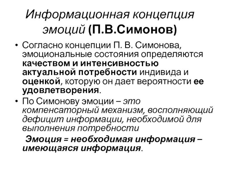 По Симонову эмоции – это компенсаторный механизм, восполняющий дефицит информации, необходимой для выполнения потребности
