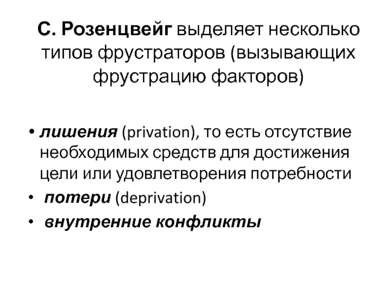 Слайд 14С. Розенцвейг выделяет несколько типов фрустраторов (вызывающих фрустрацию факторов)