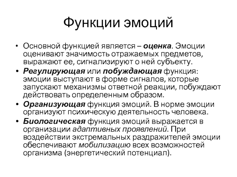 Биологическая функция эмоций выражается в организации адаптивных проявлений. При воздействии экстремальных раздражителей эмоции обеспечивают мобилизацию всех возможностей организма (энергетический потенциал).
