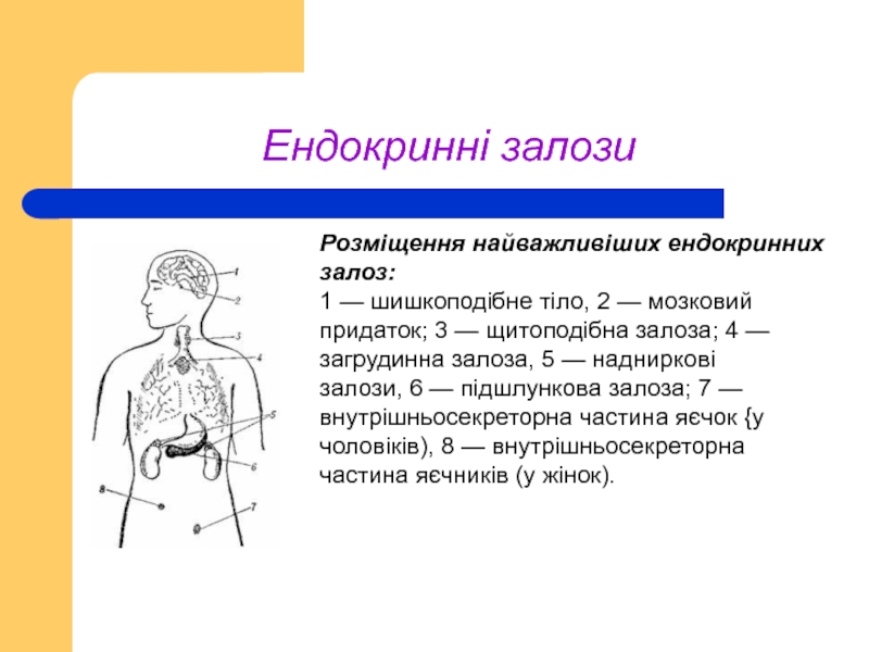 залоза, 5 — надниркові залози, 6 — підшлункова залоза; 7 — внутрішньосекреторна частина яєчок {у чоловіків), 8 — внутрішньосекреторна частина яєчників (у жінок).