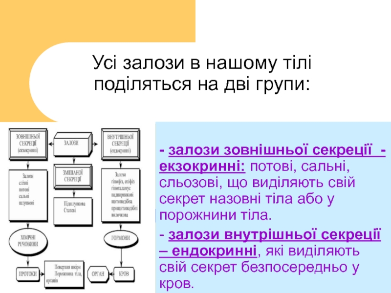 Слайд 4Усі залози в нашому тілі поділяться на дві групи: