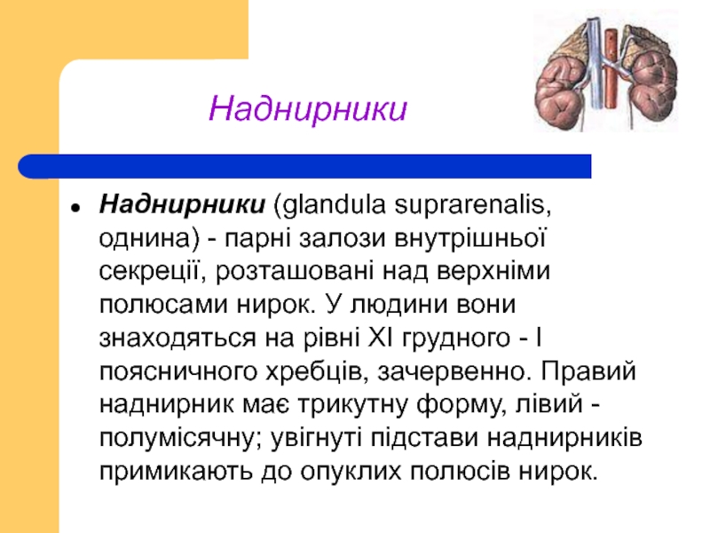 Наднирники (glandula suprarenalis, однина) - парні залози внутрішньої секреції, розташовані