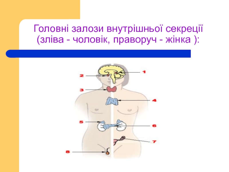 Слайд 6Головні залози внутрішньої секреції (зліва - чоловік, праворуч - жінка