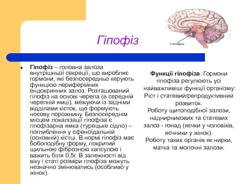 Гіпофіз – головна залоза внутрішньої секреції, що виробляє гормони, які безпосередньо