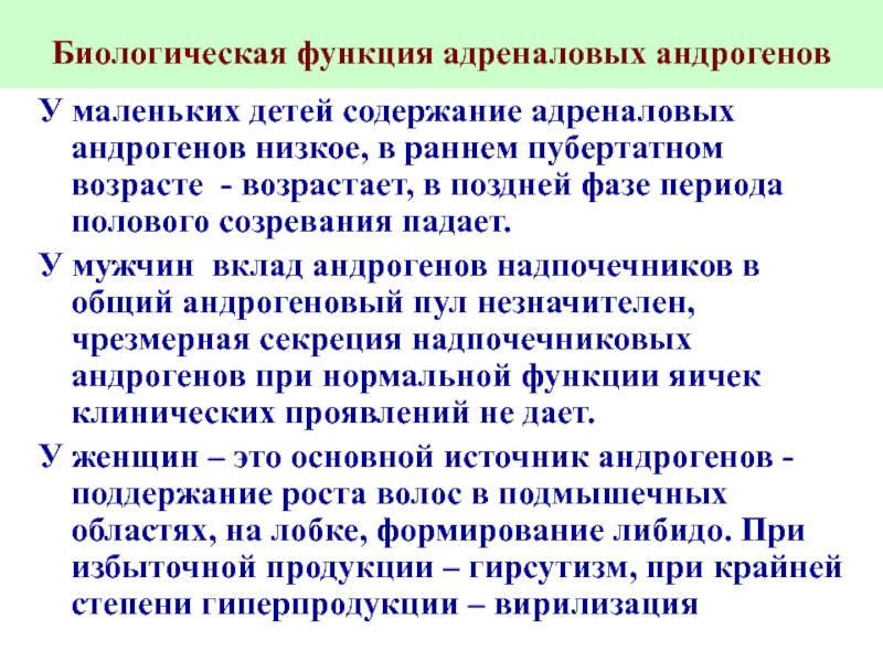 У женщин – это основной источник андрогенов - поддержание роста волос в подмышечных областях, на лобке, формирование либидо. При избыточной продукции – гирсутизм, при крайней степени гиперпродукции – вирилизация