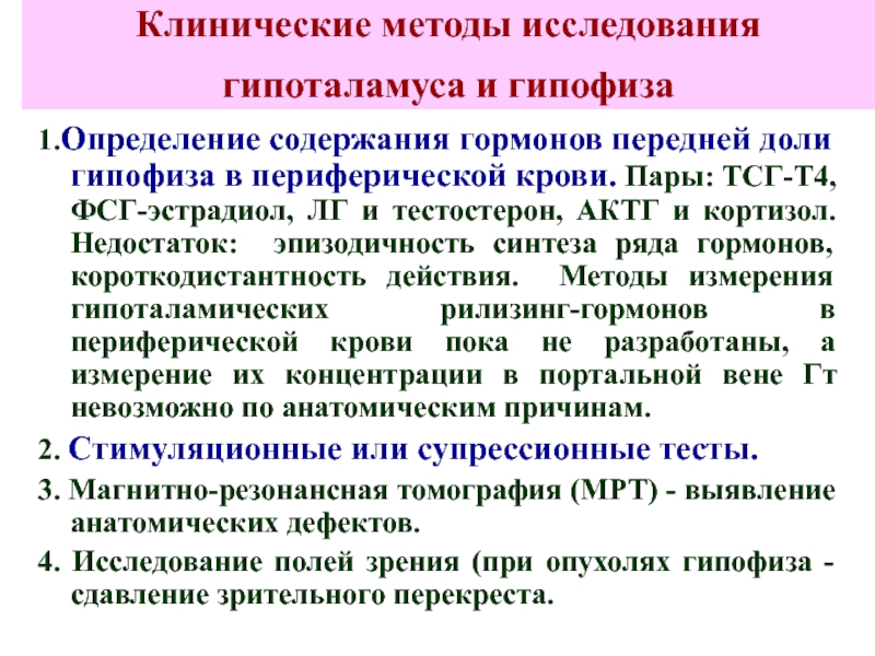 тестостерон, АКТГ и кортизол. Недостаток: эпизодичность синтеза ряда гормонов, короткодистантность действия. Методы измерения гипоталамических рилизинг-гормонов в периферической крови пока не разработаны, а измерение их концентрации в портальной вене Гт невозможно по анатомическим причинам.