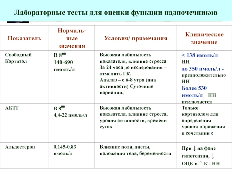 Слайд 26Лабораторные тесты для оценки функции надпочечников