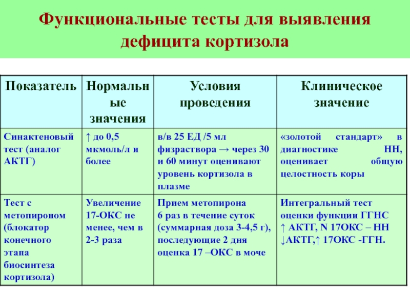 Слайд 29Функциональные тесты для выявления дефицита кортизола
