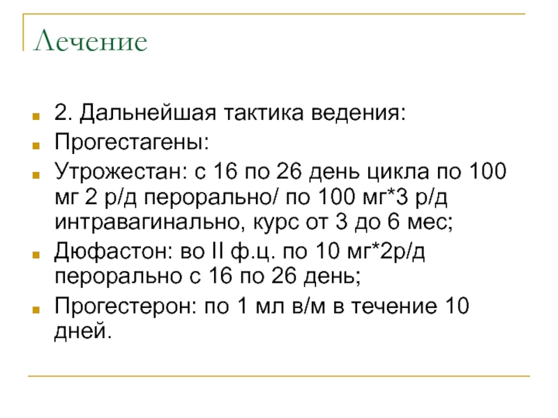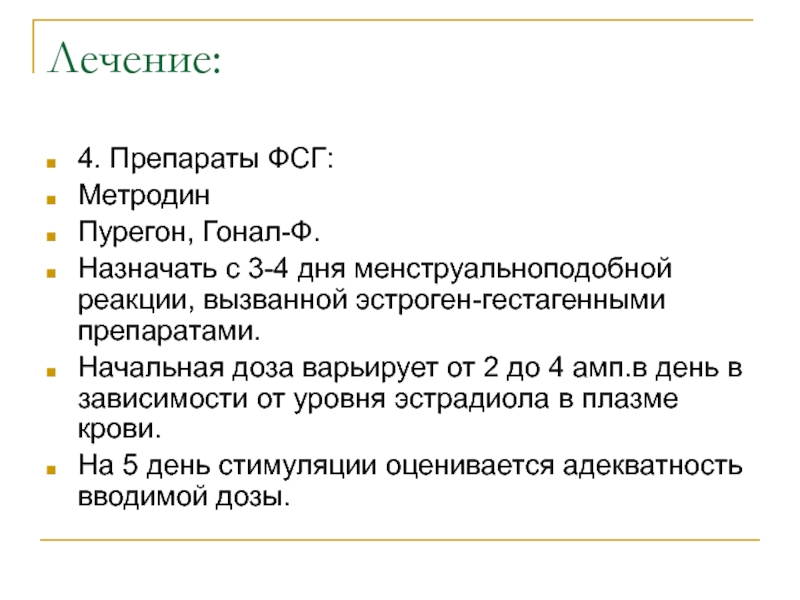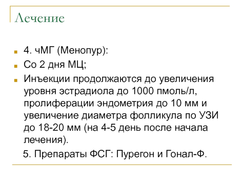 овуляции кломифеном в течение 3-6 циклов в дозе 50-150 мг/сут. с 5-9 день цикла по стандартной схеме, при неэффективности чМГ (в дозе 4500-5000 ЕД в/м, далее поддерживающие дозы чХГ по 1000-1500 ЕД с интервалом в 3-4 дня до срока предполагаемой менструации).