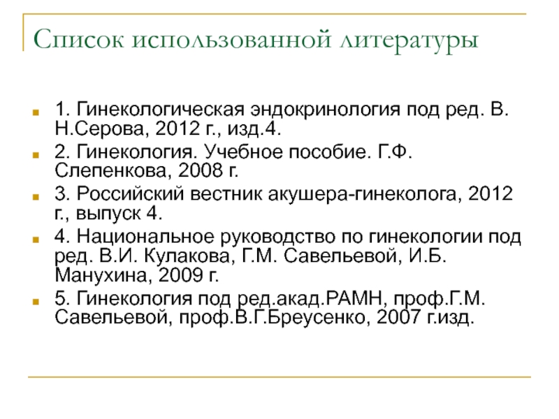 4. Национальное руководство по гинекологии под ред. В.И. Кулакова, Г.М. Савельевой, И.Б. Манухина, 2009 г.