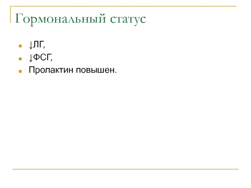 Базальный уровень гонадотропных гормонов и эстрогенов снижен.