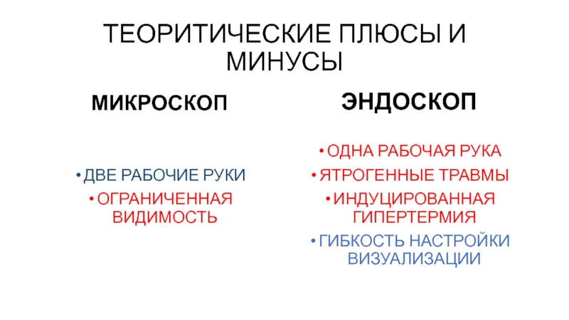 ТЕОРИТИЧЕСКИЕ ПЛЮСЫ И МИНУСЫМИКРОСКОПДВЕ РАБОЧИЕ РУКИОГРАНИЧЕННАЯ ВИДИМОСТЬЭНДОСКОПОДНА РАБОЧАЯ РУКАЯТРОГЕННЫЕ ТРАВМЫ ИНДУЦИРОВАННАЯ ГИПЕРТЕРМИЯГИБКОСТЬ НАСТРОЙКИ ВИЗУАЛИЗАЦИИ