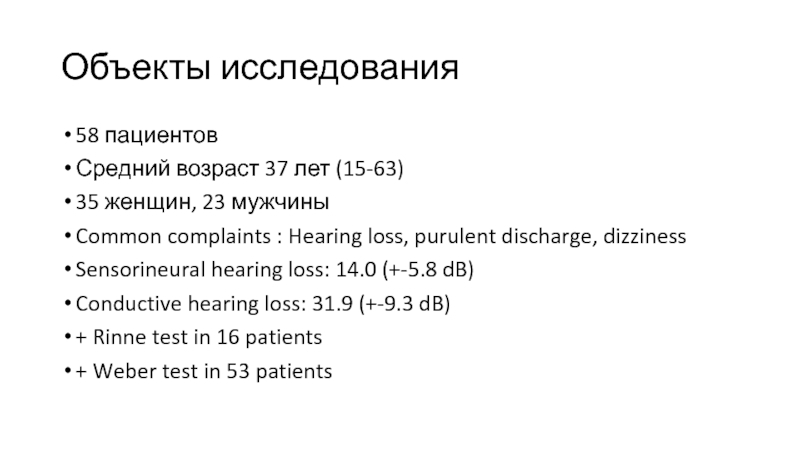 Объекты исследования58 пациентовСредний возраст 37 лет (15-63)35 женщин, 23 мужчиныCommon complaints : Hearing loss, purulent discharge, dizzinessSensorineural