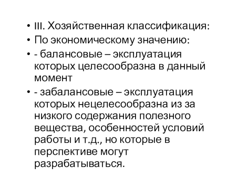 низкого содержания полезного вещества, особенностей условий работы и т.д., но которые в перспективе могут разрабатываться.