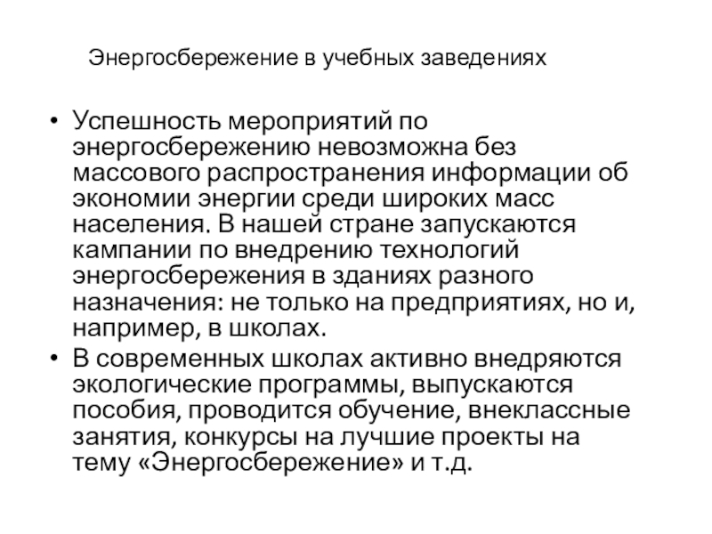 В современных школах активно внедряются экологические программы, выпускаются пособия, проводится обучение, внеклассные занятия, конкурсы на лучшие проекты на тему «Энергосбережение» и т.д.