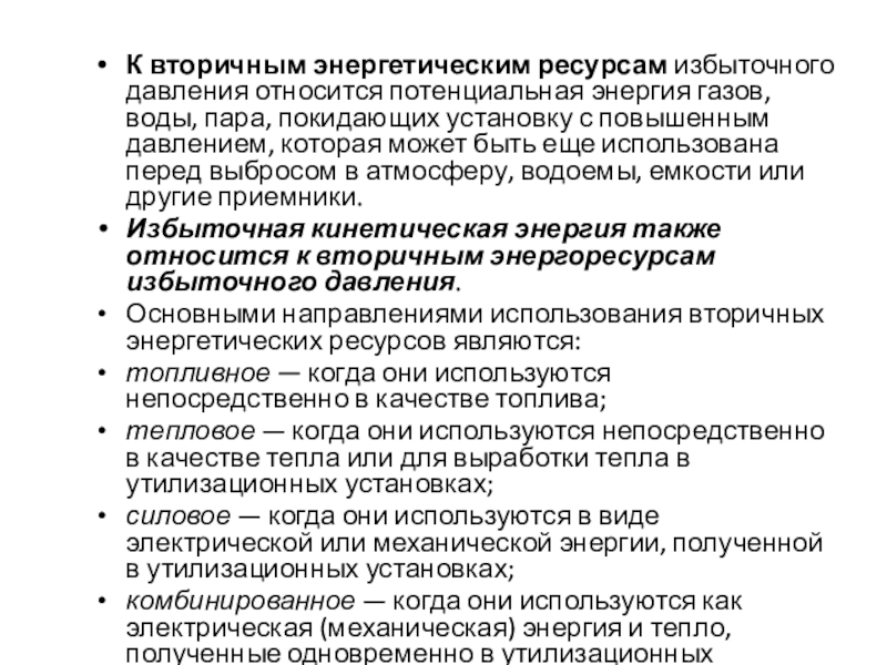 Избыточная кинетическая энергия также относится к вторичным энергоресурсам избыточного давления.