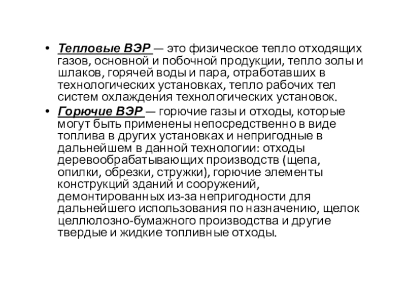 Слайд 12Тепловые ВЭР — это физическое тепло отходящих газов, основной и