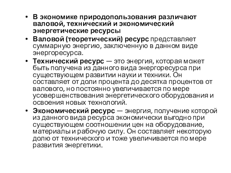 Слайд 9В экономике природопользования различают валовой, технический и экономический энергетические ресурсы