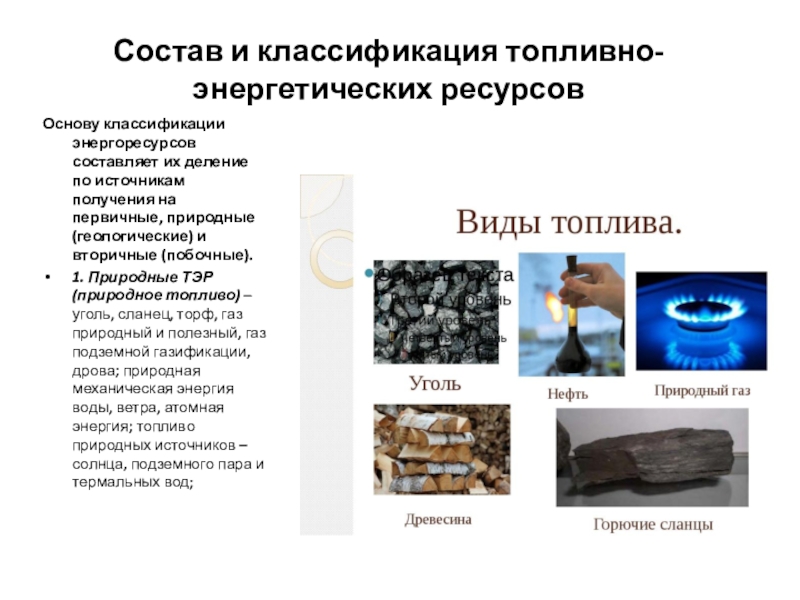 Природные ТЭР (природное топливо) – уголь, сланец, торф, газ природный и полезный, газ подземной газификации, дрова; природная механическая энергия воды, ветра, атомная энергия; топливо природных источников – солнца, подземного пара и термальных вод;