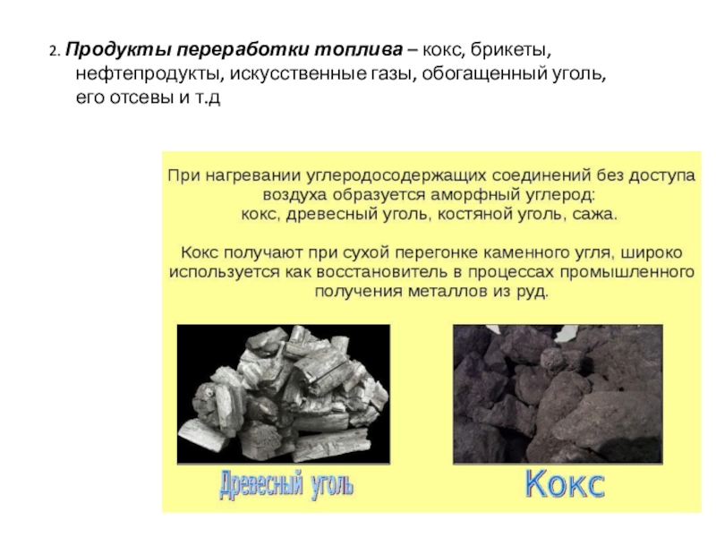 Слайд 62. Продукты переработки топлива – кокс, брикеты, нефтепродукты, искусственные газы,