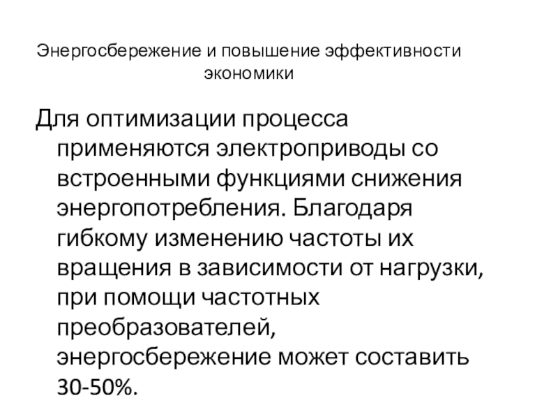 в зависимости от нагрузки, при помощи частотных преобразователей, энергосбережение может составить 30-50%.