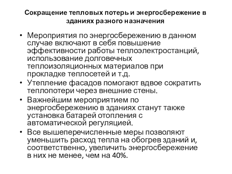 Слайд 3Сокращение тепловых потерь и энергосбережение в зданиях разного назначения