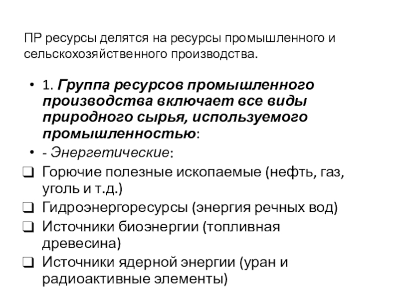 Слайд 21ПР ресурсы делятся на ресурсы промышленного и сельскохозяйственного производства.