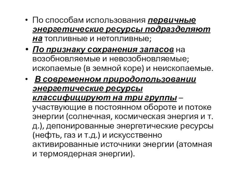 В современном природопользовании энергетические ресурсы классифицируют на три группы – участвующие в постоянном обороте и потоке энергии (солнечная, космическая энергия и т.д.), депонированные энергетические ресурсы (нефть, газ и т.д.) и искусственно активированные источники энергии (атомная и термоядерная энергии).