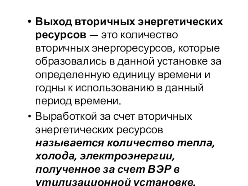 Слайд 10Выход вторичных энергетических ресурсов — это количество вторичных энергоресурсов, которые