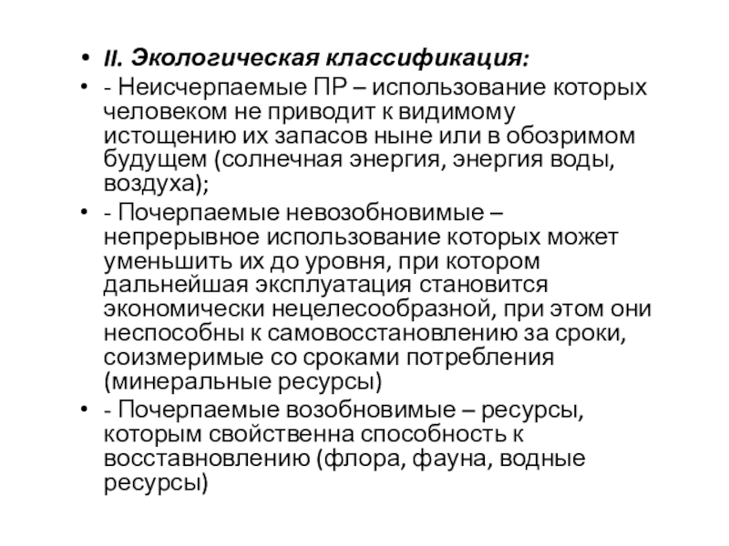 - Почерпаемые возобновимые – ресурсы, которым свойственна способность к восставновлению (флора, фауна, водные ресурсы)