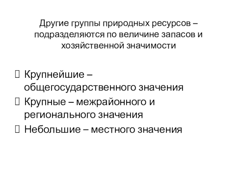 Слайд 25Другие группы природных ресурсов – подразделяются по величине запасов и