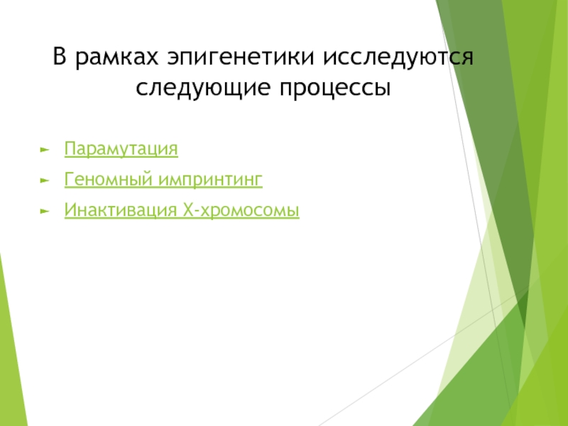 В рамках эпигенетики исследуются следующие процессыПарамутацияГеномный импринтингИнактивация X-хромосомы