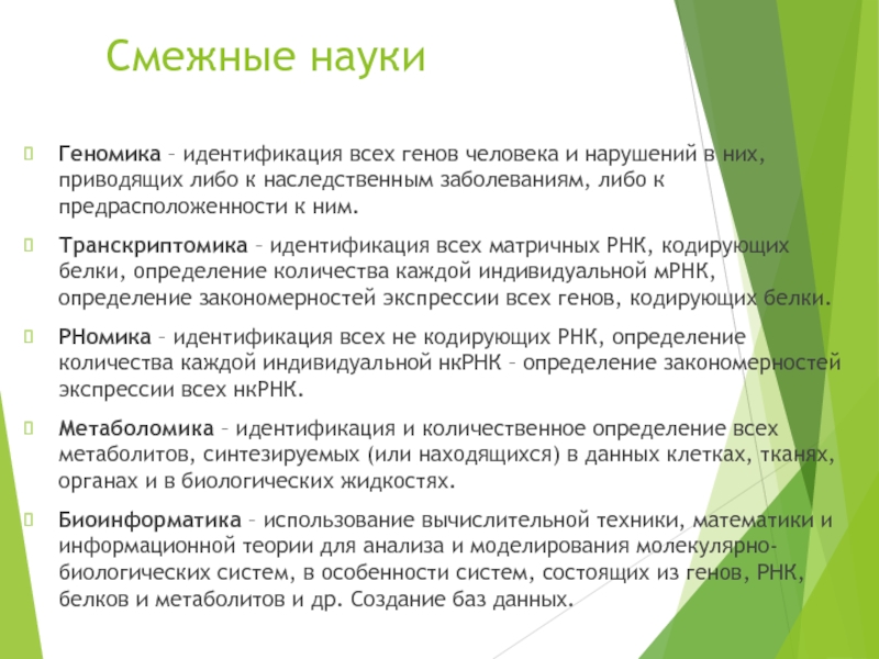 Смежные наукиГеномика – идентификация всех генов человека и нарушений в них, приводящих либо к наследственным заболеваниям, либо к