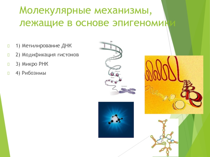 Молекулярные механизмы, лежащие в основе эпигеномики1) Метилирование ДНК2) Модификация гистонов3) Микро РНК 4) Рибозимы