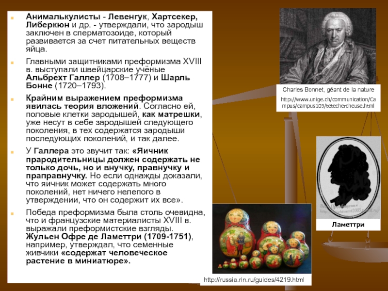 Победа преформизма была столь очевидна, что и французские материалисты XVIII в. выражали преформистские взгляды. Жульен Офре де Ламеттри (1709-1751), например, утверждал, что семенные живчики «содержат человеческое растение в миниатюре».