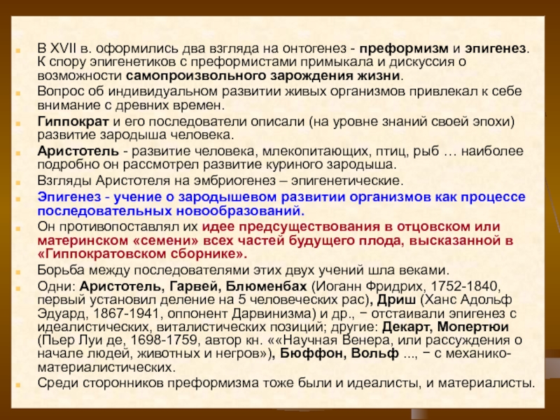 Одни: Аристотель, Гарвей, Блюменбах (Иоганн Фридрих, 1752-1840, первый установил деление на 5 человеческих рас), Дриш (Ханс Адольф Эдуард, 1867-1941, оппонент Дарвинизма) и др., отстаивали эпигенез с идеалистических, виталистических позиций; другие: Декарт, Мопертюи (Пьер Луи де, 1698-1759, автор кн. ««Научная Венера, или рассуждения о начале людей, животных и негров»), Бюффон, Вольф ..., с механико-материалистических.