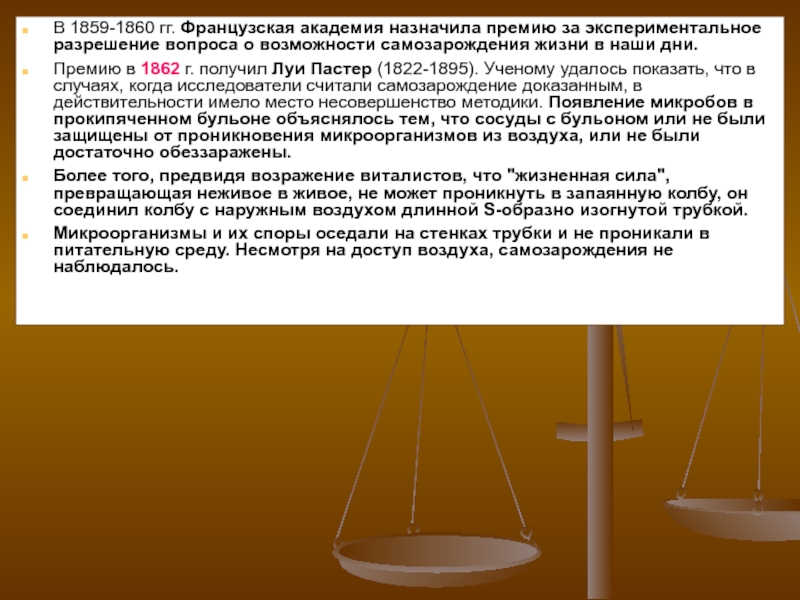 1862 г. получил Луи Пастер (1822-1895). Ученому удалось показать, что в случаях, когда исследователи считали самозарождение доказанным, в действительности имело место несовершенство методики. Появление микробов в прокипяченном бульоне объяснялось тем, что сосуды с бульоном или не были защищены от проникновения микроорганизмов из воздуха, или не были достаточно обеззаражены.