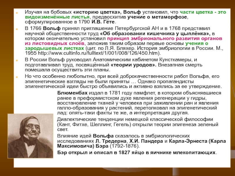 Влияние идей Вольфа сказалось в эмбриологических исследованиях Л. Тредерна, Х.И. Пандера и Карла-Эрнеста (Карла Максимовича) Бэра (1792-1876).