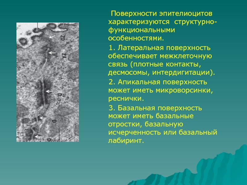 Слайд 6 Поверхности эпителиоцитов характеризуются структурно-функциональными особенностями.