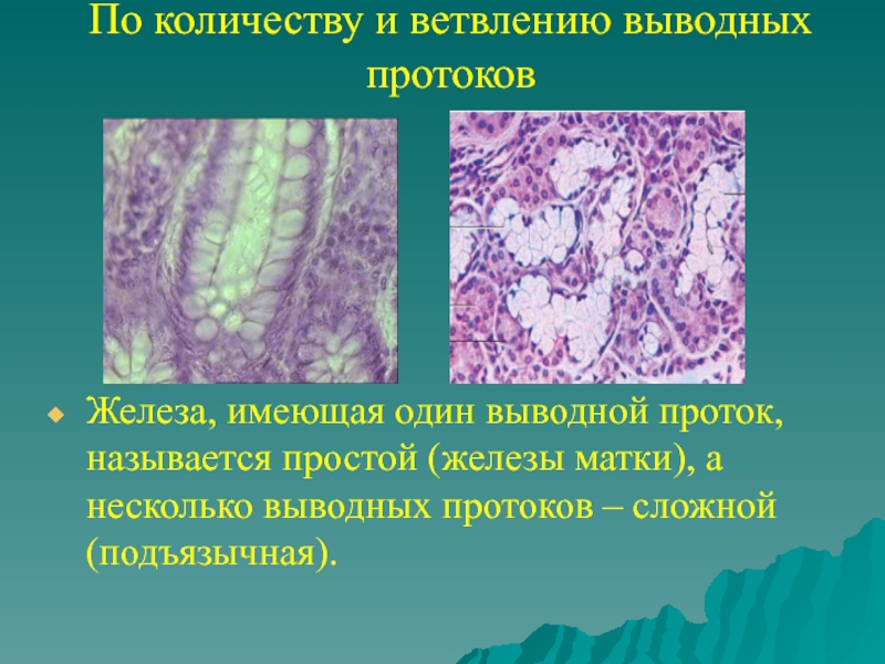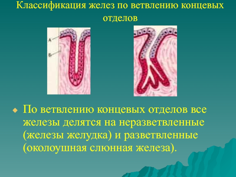 железы делятся на неразветвленные (железы желудка) и разветвленные (околоушная слюнная