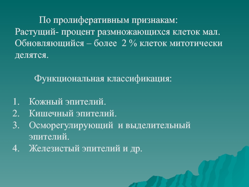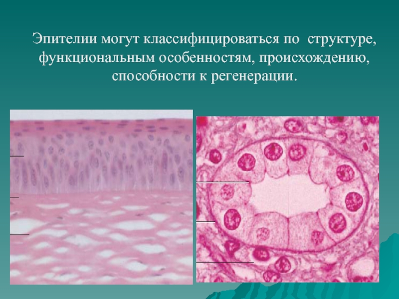 Слайд 13Эпителии могут классифицироваться по структуре, функциональным особенностям, происхождению, способности к