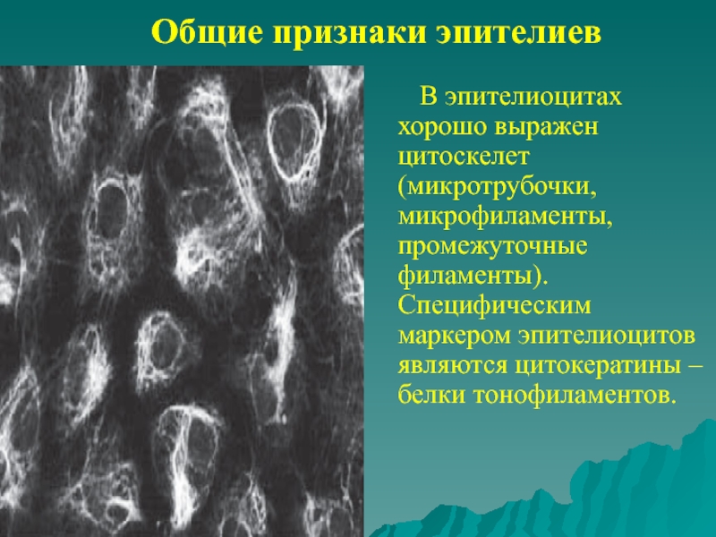 цитоскелет (микротрубочки, микрофиламенты, промежуточные филаменты). Специфическим маркером эпителиоцитов являются цитокератины