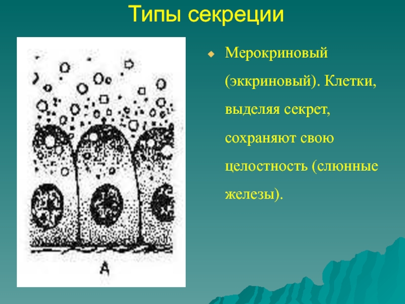 Мерокриновый (эккриновый). Клетки, выделяя секрет, сохраняют свою целостность (слюнные