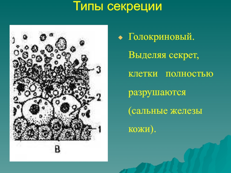 Голокриновый. Выделяя секрет, клетки полностью разрушаются (сальные железы