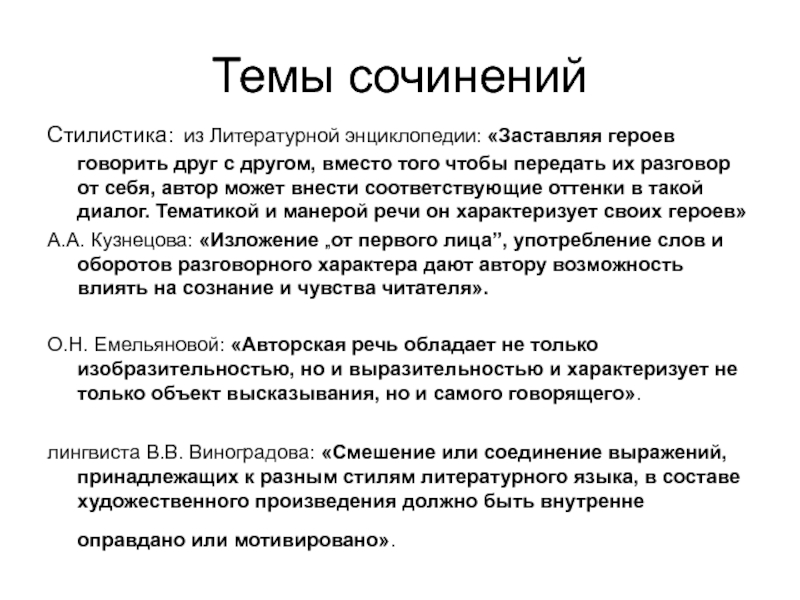 лингвиста В.В. Виноградова: «Смешение или соединение выражений, принадлежащих к разным стилям литературного языка, в составе художественного произведения должно быть внутренне оправдано или мотивировано».