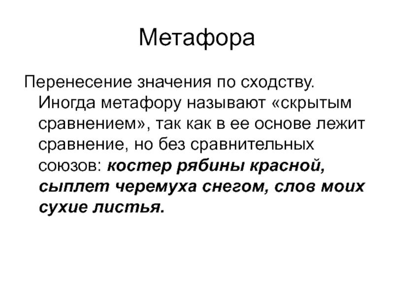 Перенесение значения по сходству. Иногда метафору называют «скрытым сравнением», так