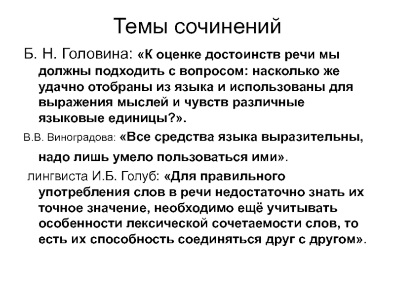 лингвиста И.Б. Голуб: «Для правильного употребления слов в речи недостаточно знать их точное значение, необходимо ещё учитывать особенности лексической сочетаемости слов, то есть их способность соединяться друг с другом».