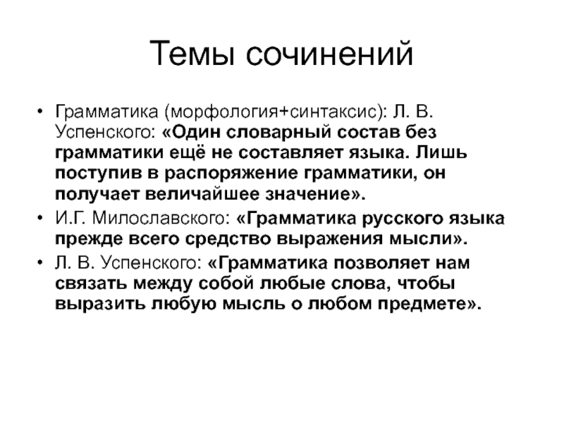 Л. В. Успенского: «Грамматика позволяет нам связать между собой любые слова, чтобы выразить любую мысль о любом предмете».